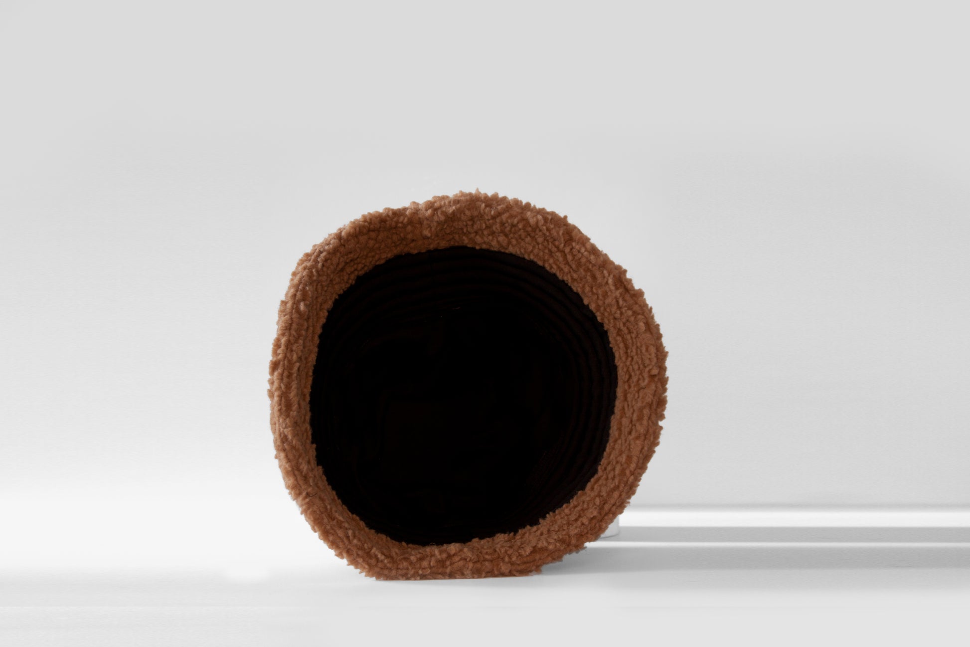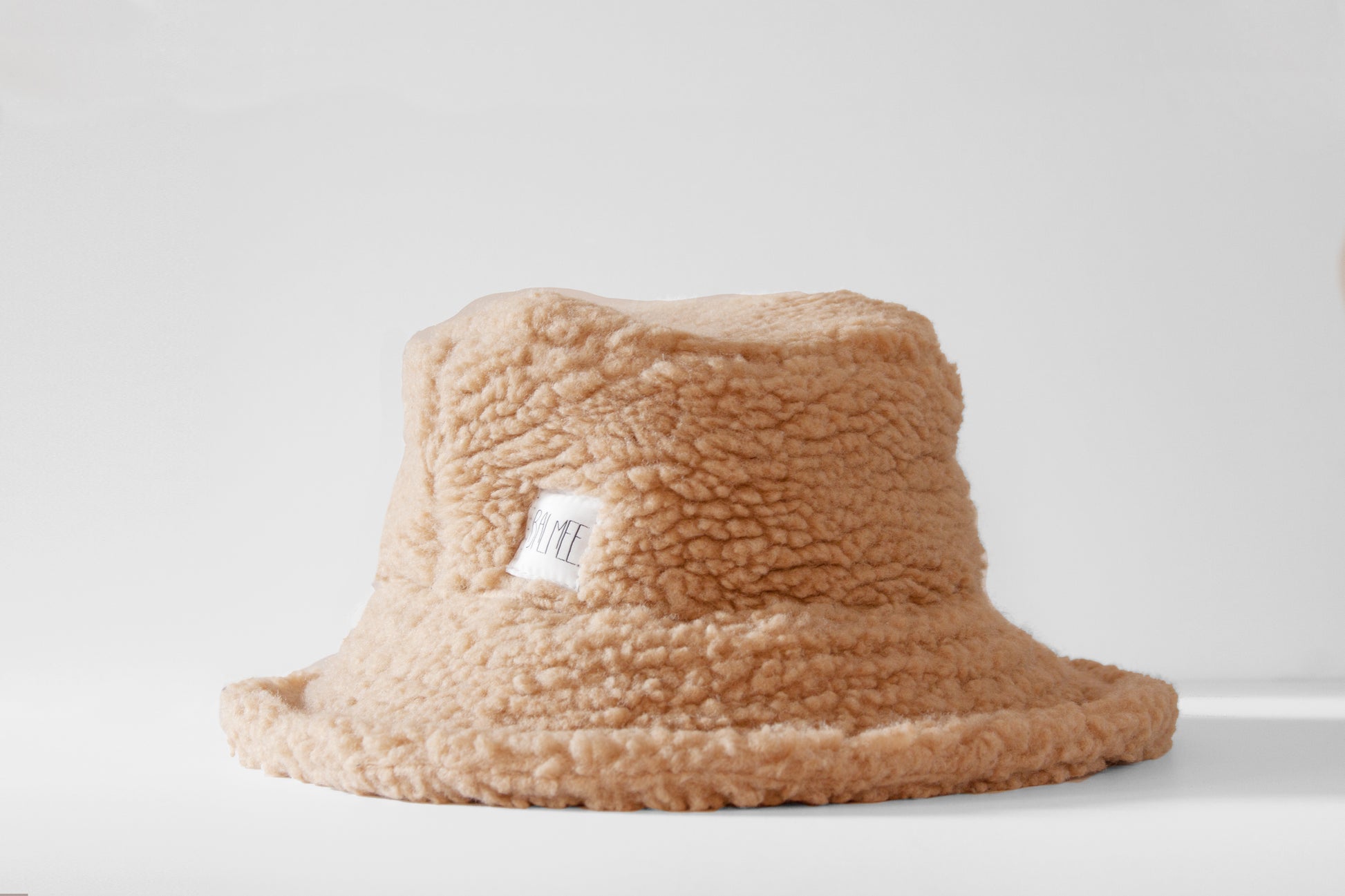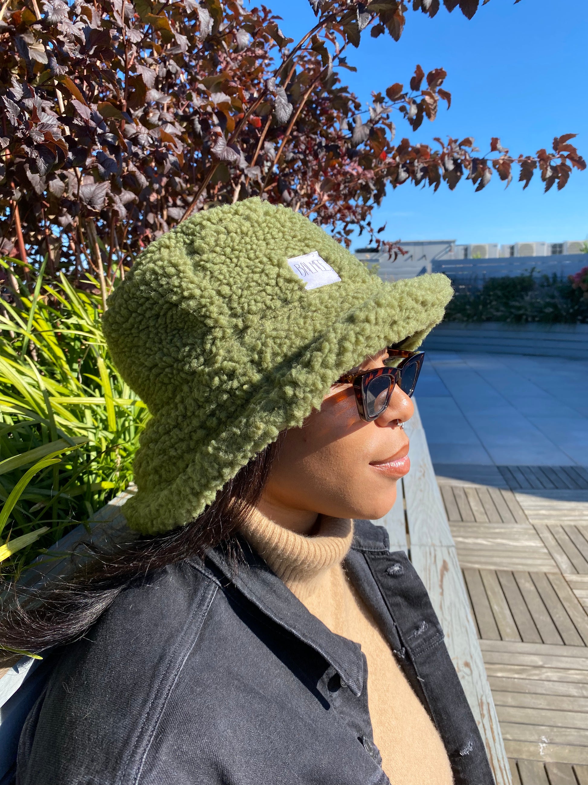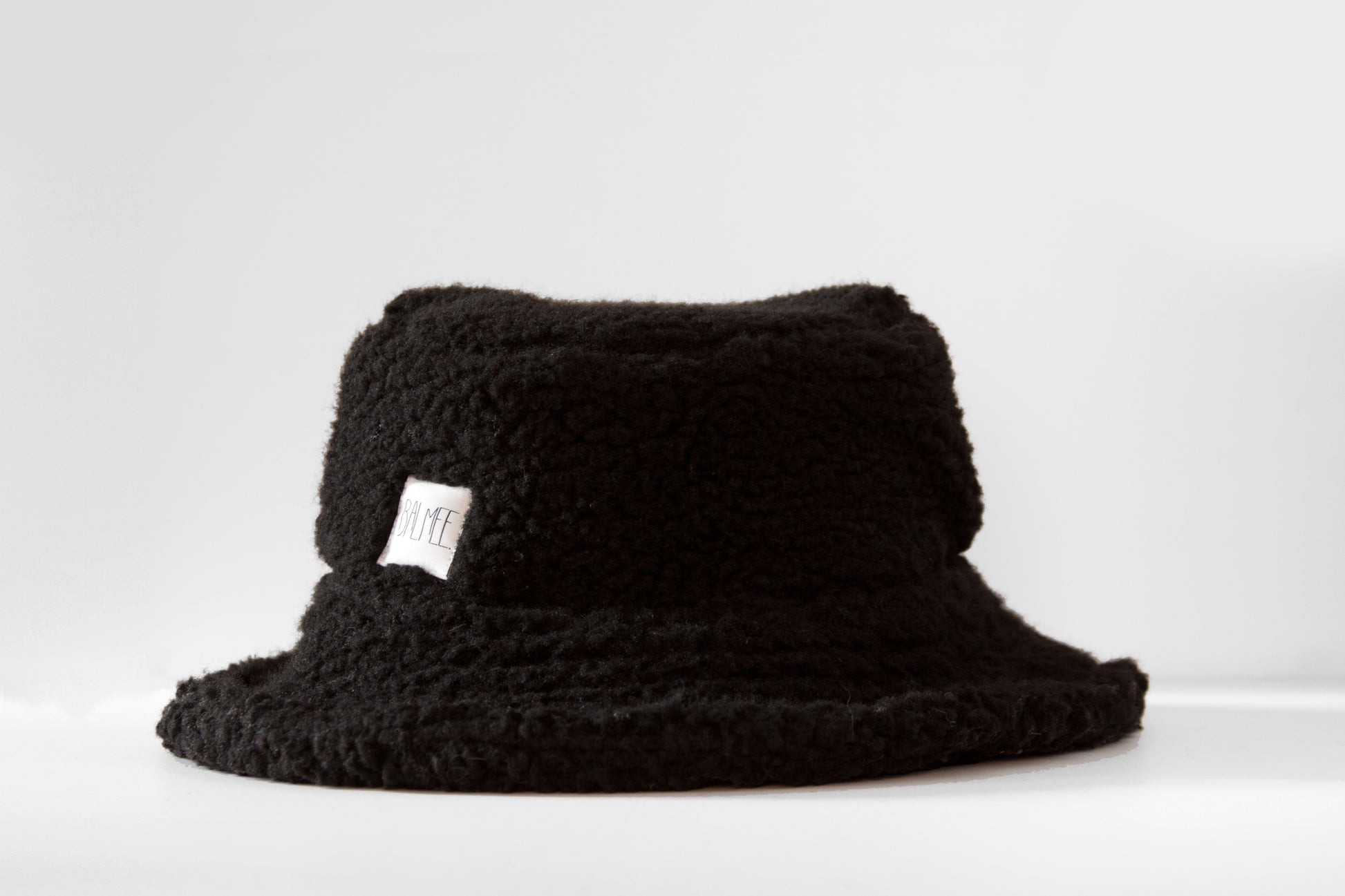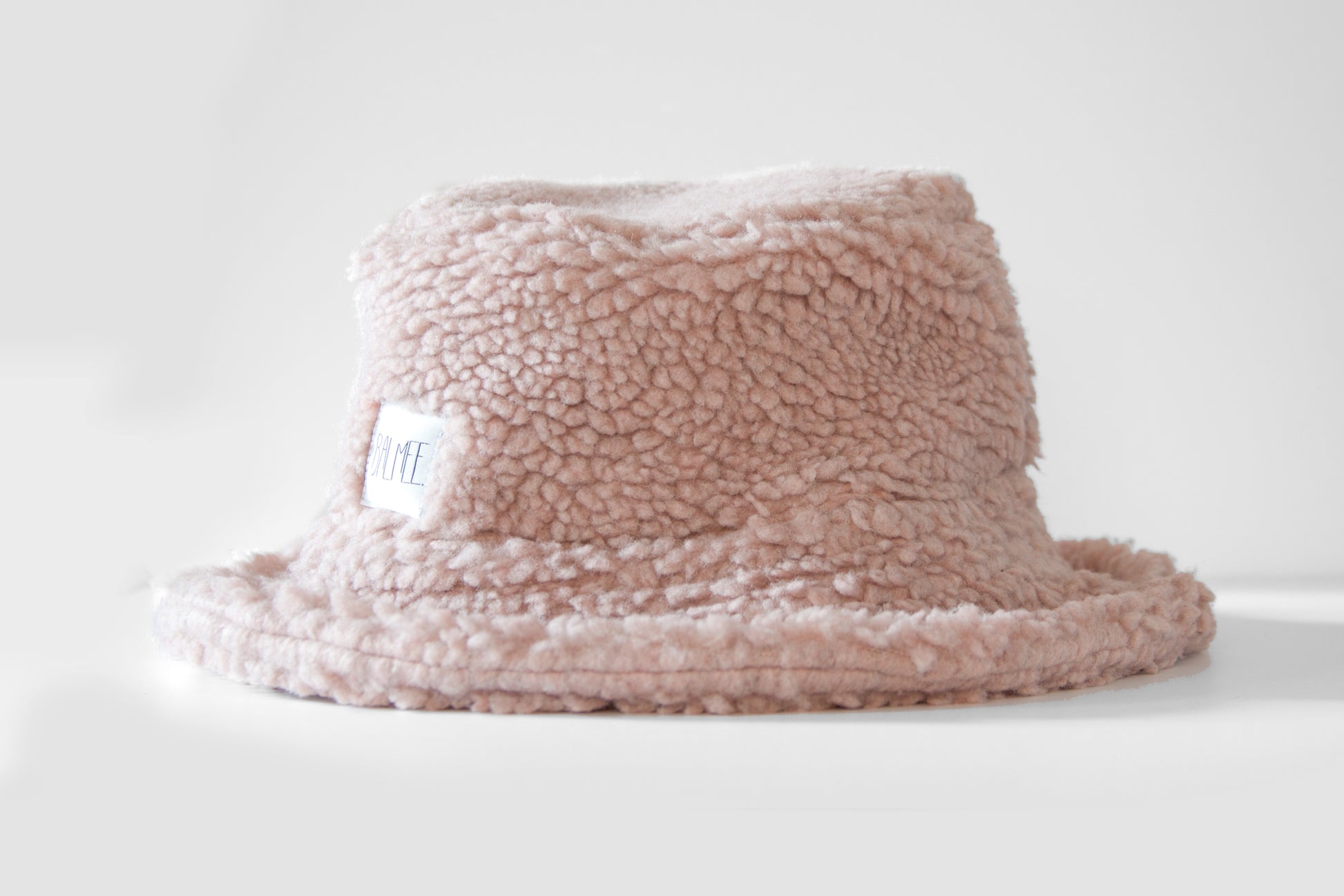 The BALMEE Bucket - long-brimmed, fuzzy bucket hat, satin-lined for added hair protection.